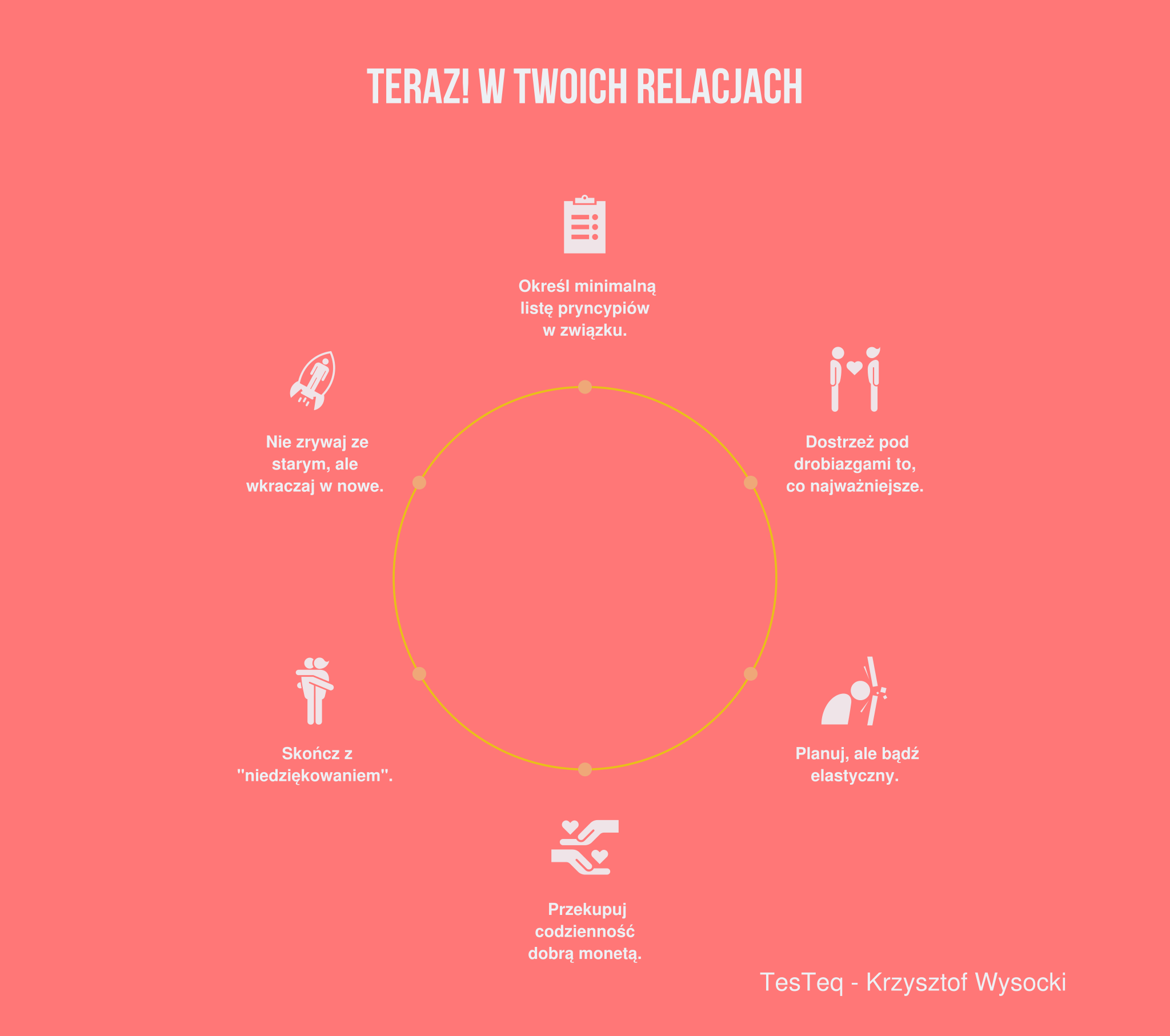 Kontynuujemy przedświąteczny Długi Kolorowy Weekend z infografikami ilustrującymi praktykę podejmowania właściwych decyzji zgodnie z zasadami przedstawionymi w mojej książce „Teraz! Jak już dziś zmienić jutro?”. Dziś proponuję „dania na wynos” podsumowujące rozdział czternasty „Teraz! w twoim związku. Jak nie robić z igły wideł oraz zadbać o to, co najważniejsze i najbliższe sercu?”. Objaśnienia i szczegóły znajdziesz w papierowym, elektronicznym lub audio wydaniu „Teraz! Jak już dziś zmienić jutro?”.